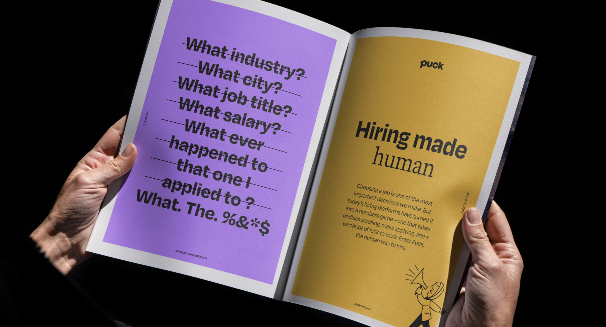In an era of automated resume screens and one-click applications, Puck is the human way to hire. I partnered with Jessica Strelioff and the team at Puck to shape their brand from Day 0, giving them a foundation to build on across positioning, voice, and copywriting.